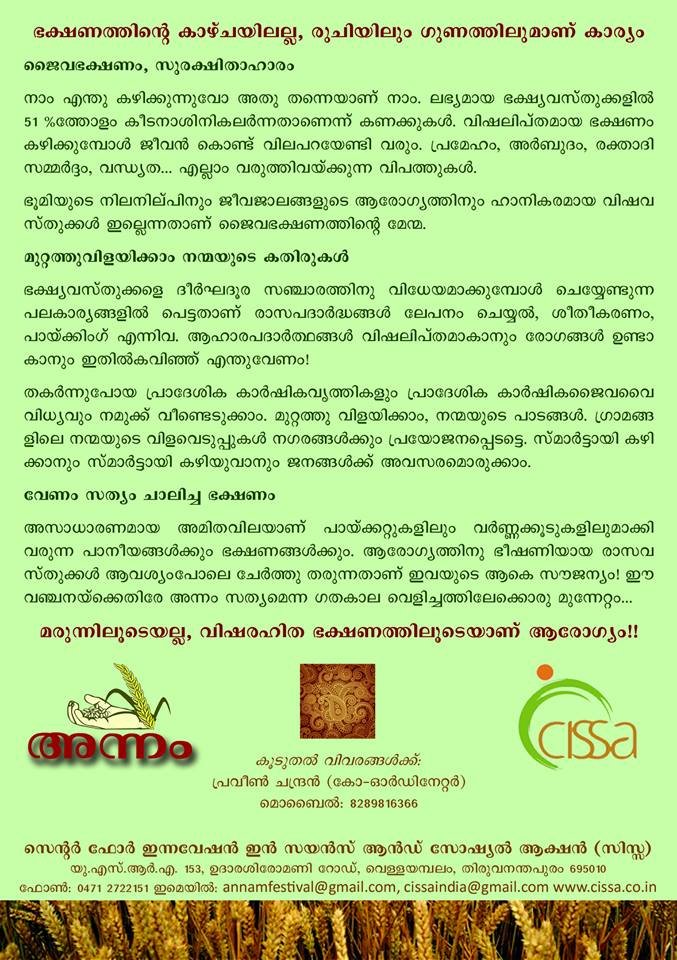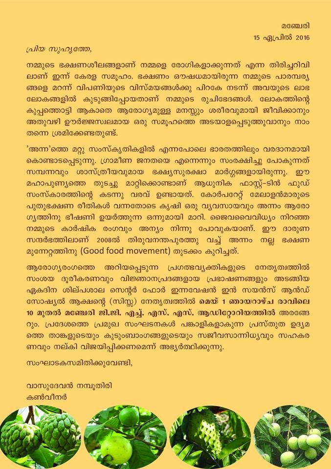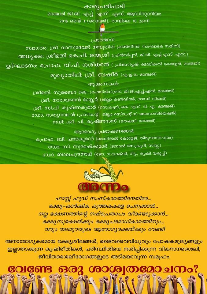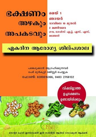 Centre for Innovation in Science and Social Action (CISSA) is organizing one day workshop on ‘Food: Beauty and the Beast’ from 10am to 2pm on May 1, the International Workers’ Day. Venue is Government Girls Higher Secondary School, Manjeri. The event will be inaugurated by Principal of Govt. Medical College, Manjeri, Prof. V.P. Sasidharan. Principal of the Higher Secondary School, Smt. K.P. Jayasree will preside over the function in which chief guest will be District Education Officer, Shri. Basheer. Dr. B. Padmakumar (Medical College, Thiruvananthapuram); Dr. C. Suresh Kumar (General Secretary, CISSA; and Paediatrician) and Dr. Balachandra Nath (Jt. Director – Rtd., Department of Agriculture, Kerala) will deliver Health Talks. There will be healthy lunch arranged for participants. For more information, call: 8289816366 (Mr. Praveen Chandran, Coordinator),