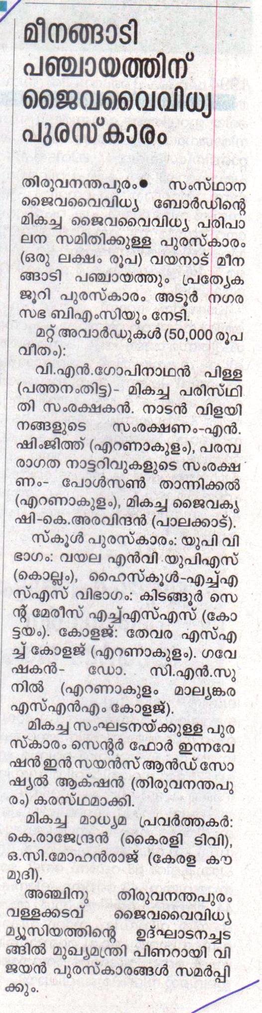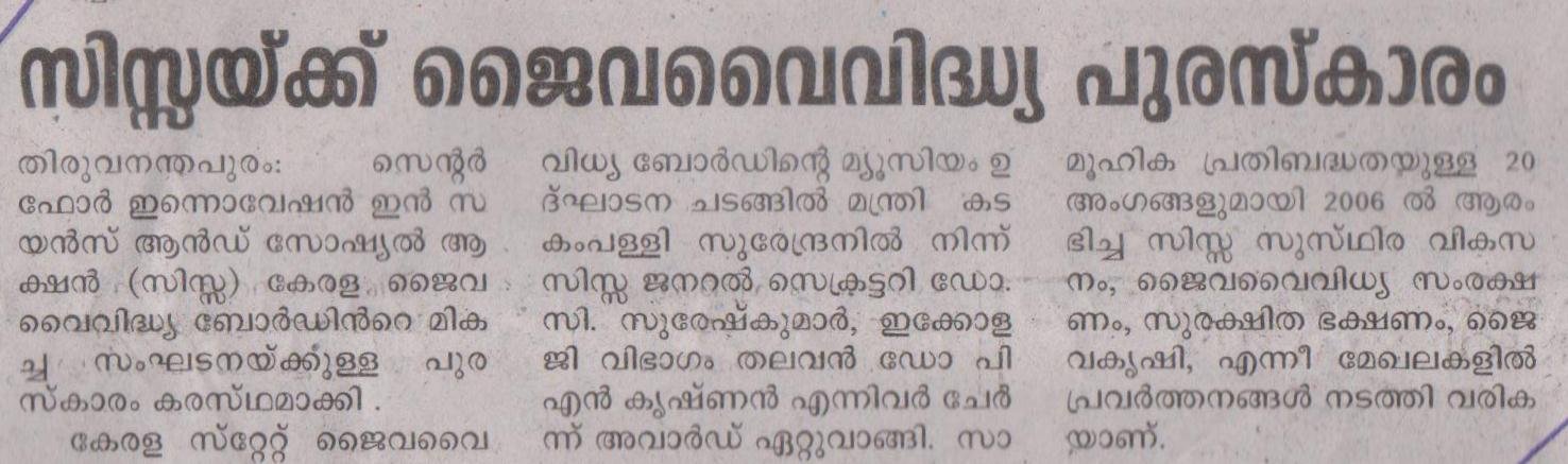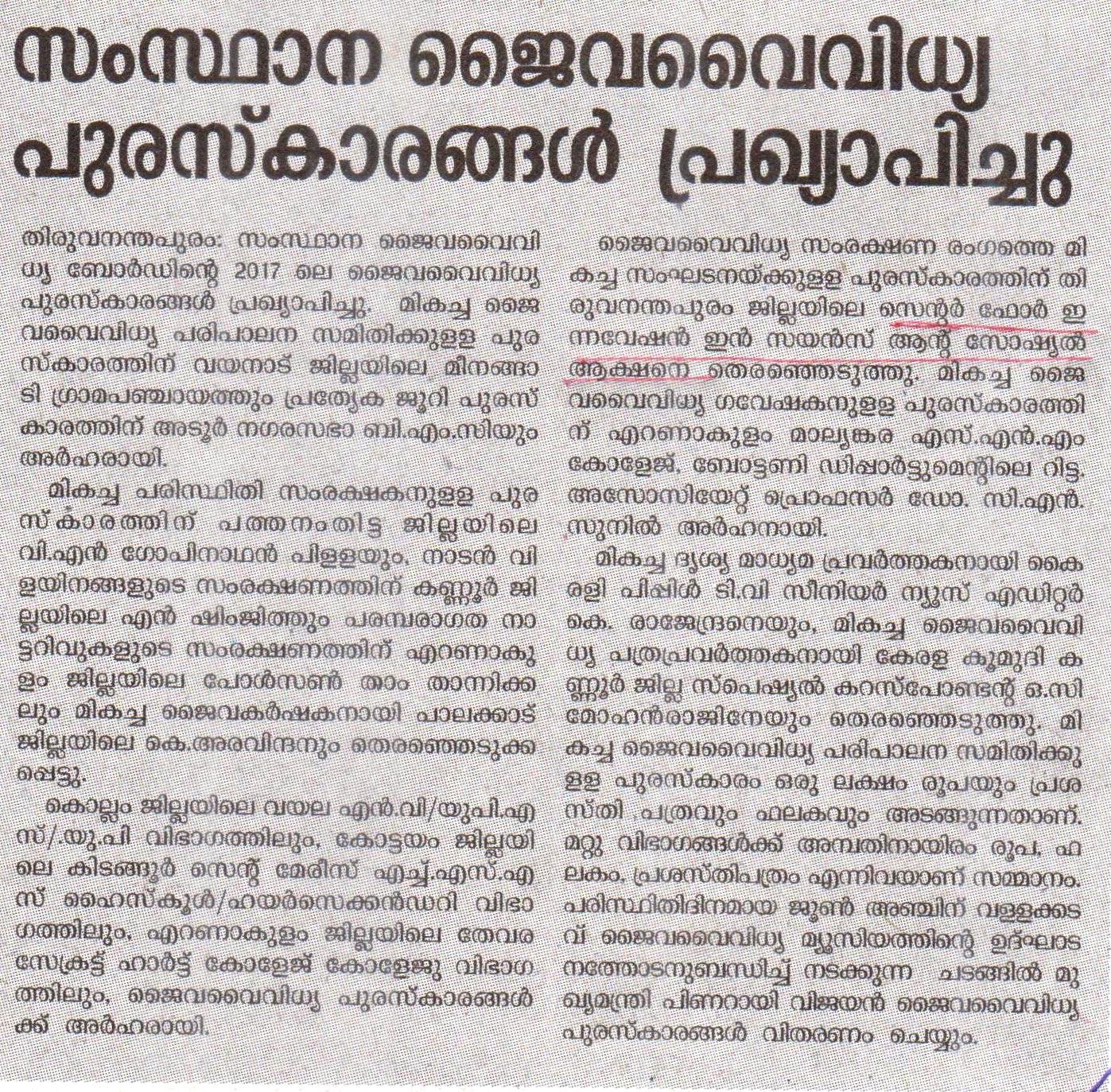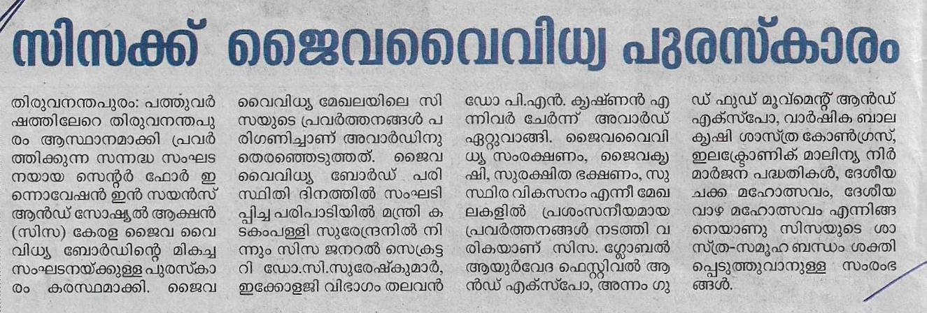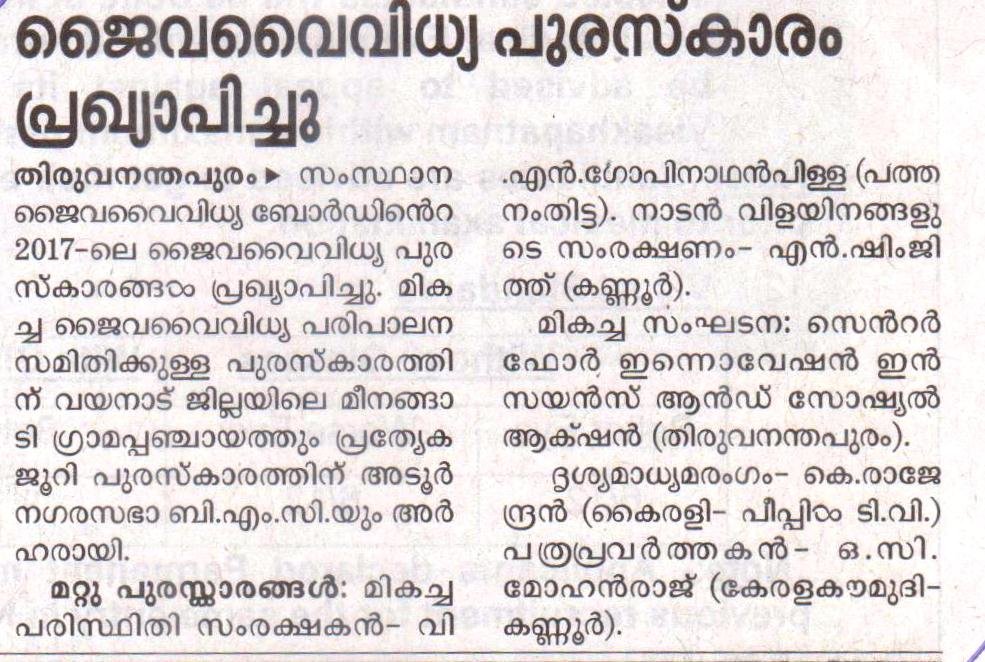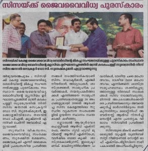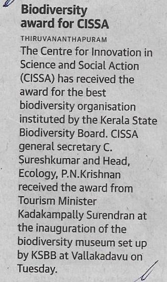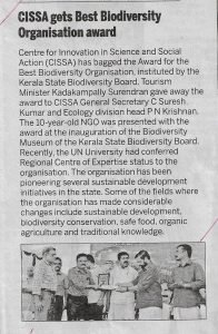 CISSA bagged Biodiversity Award 2017 from Kerala State Biodiversity Board