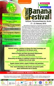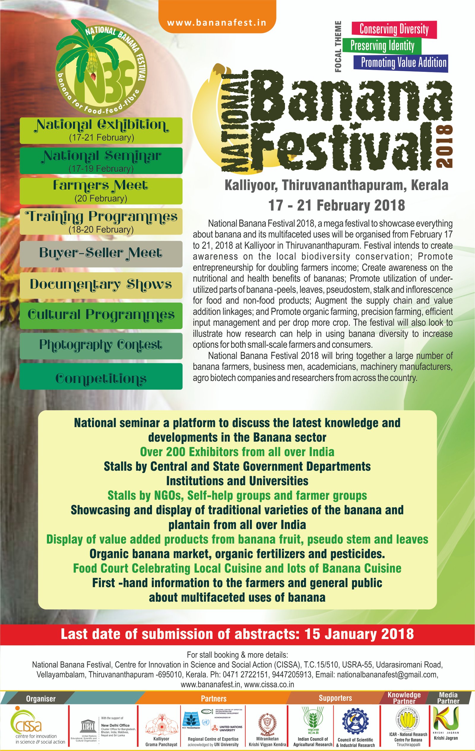 National Banana Festival (NBF-2018) is being organized during 17-21 February 2018 in Thiruvananthapuram by Centre for Innovation in Science & Social Action (CISSA). Collaborators of this mega event are Kalliyoor Grama Panchayat, Regional Centre of Expertise (RCE) acknowledged by United Nations University; ICAR- National Centre for Banana, Tiruchirapalli; UNESCO New Delhi, Central and State Government institutions involved in Banana Research & Promotion and NGOs working in this sector.